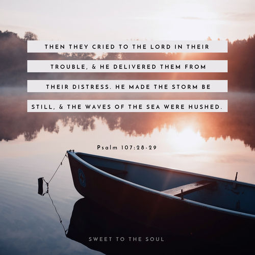 Psalm 107:28-29 | Then they cried to the LORD in their trouble, and he delivered them from their distress. He made the storm be still, and the waves of the sea were hushed. |